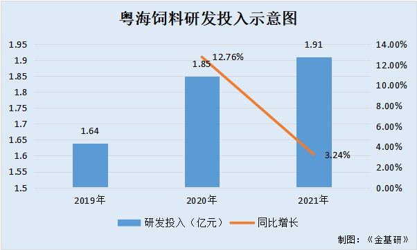 2019-2021年,粤海饲料的研发投入分别为1.64亿元、1.85亿元、1.91亿元,2020-2021年分别同比增长12.76%、3.24%。