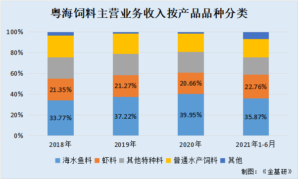 2018-2020年及2021年1-6月,粤海饲料的特种水产饲料销售收入分别为39.48亿元、39.92亿元、47.09亿元、19.52亿元,占主营业务收入的比例分别为75.31%、78.93%、80.72%、75.71%。