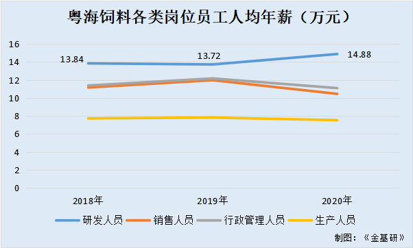 2018-2020年,粤海饲料研发人员的人均年薪分别为13.84万元、13.72万元、14.88万元。同期,粤海饲料销售人员的人均年薪分别为11.16万元、11.97万元、10.45万元;行政管理人员的人均年薪分别为11.38万元、12.17万元、11.09万元;生产人员的人均年薪分别为7.73万元、7.82万元、7.53万元。