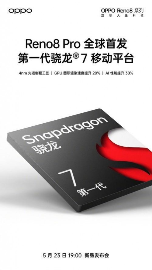 伴随着全新一代骁龙移动平台的推出,OPPO官方正式宣布,于5月23日发布的Reno8 Pro将全球首发第一代骁龙7移动平台。通过第一代骁龙7移动平台的旗舰级实力,配合OPPO自研的马里亚纳® MariSilicon X芯片,将为消费者带来性能体验和影像实力的全面升级。