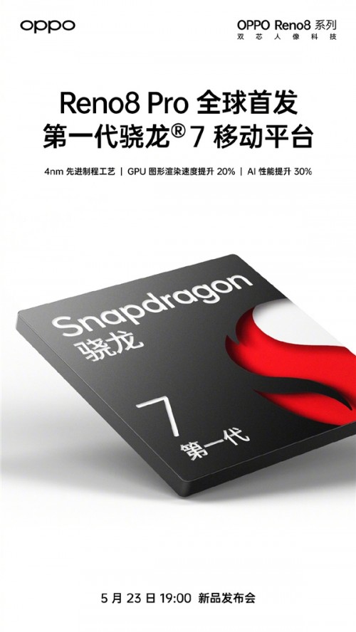 5月20日晚高通正式发布了第一代骁龙 7 Gen 1移动平台,采用4nm制程工艺打造的移动平台,在性能、影像方面都都有全面的提升。与此同时,OPPO也官宣于5月23日发布的OPPO Reno8 Pro将全球首发第一代骁龙 7 Gen 1移动平台,搭配自研马里亚纳® MariSilicon X芯片,为消费者带来性能体验和影像实力方面的强劲升级。