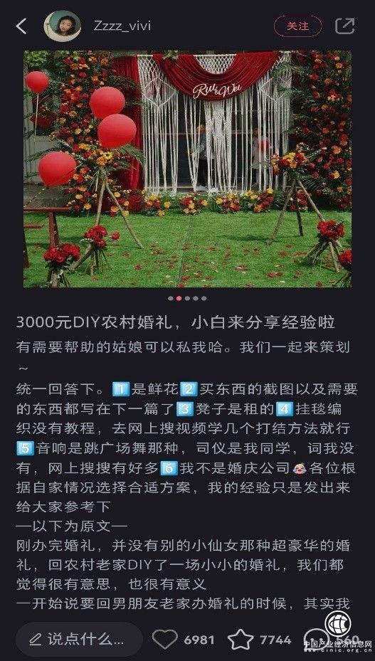 博主Zzzz_vivi就在小红书晒出了自己的农村婚礼。从丈量场地、草图设计、到婚礼现场调度指挥,张女士和老公全程DIY,把自己的婚礼“操办成了艺术品”。她的小红书笔记至今已被30多万人观看,很多人留言表示自己婚礼也要“抄作业”。