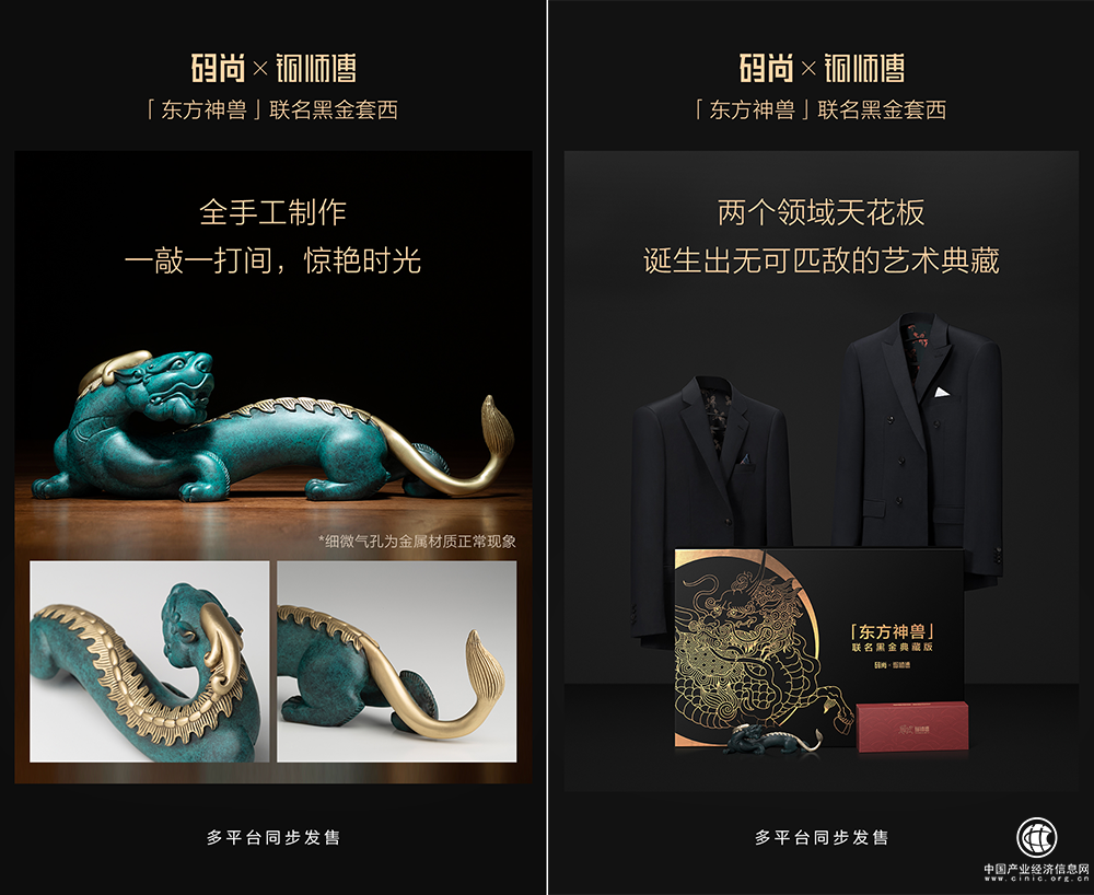 近日,智能定制男装创领者码尚联手“国内铜艺术知名品牌”铜师傅,推出联名藏品——东方神兽·联名限量黑金套西。码尚在此款产品中融入中国传统元素,并采用智能定制算法、高定工艺,将码尚的现代科技审美与铜师傅的传统文化艺术相融合,让穿着者充分地自我表达,更好的传递“定制,不止于合身”的品牌理念。同时,码尚也希望以此助力中国传统文化的弘扬与传承,以服饰为载体,向世界展示中华传统文化的魅力与故事。