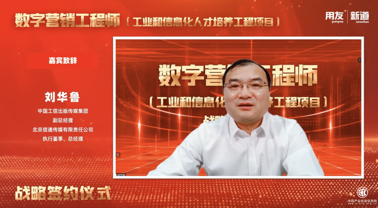 中国工信出版传媒集团副总经理,北京信通传媒有限责任公司执行董事、总经理刘华鲁介绍,北京信通传媒有限责任公司是中国工信出版传媒集团的子公司,是工业和信息化部所属企业。数字营销工程师人才培养项目是在数字化转型趋势下由信通传媒开发的人才培养项目,培养能够利用大数据、人工智能等新兴数字技术,在市场营销环节进行产品推广、市场开拓、消费者挖掘,实现营销智能化的复合型人才。他表示,新道科技与信通传媒签约合作,是双方在教育培训领域新的合作尝试,相信通过双方强强联合,一定能够为培养数字经济人才培养做出积极贡献。
