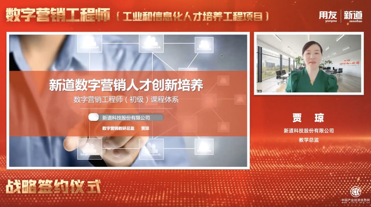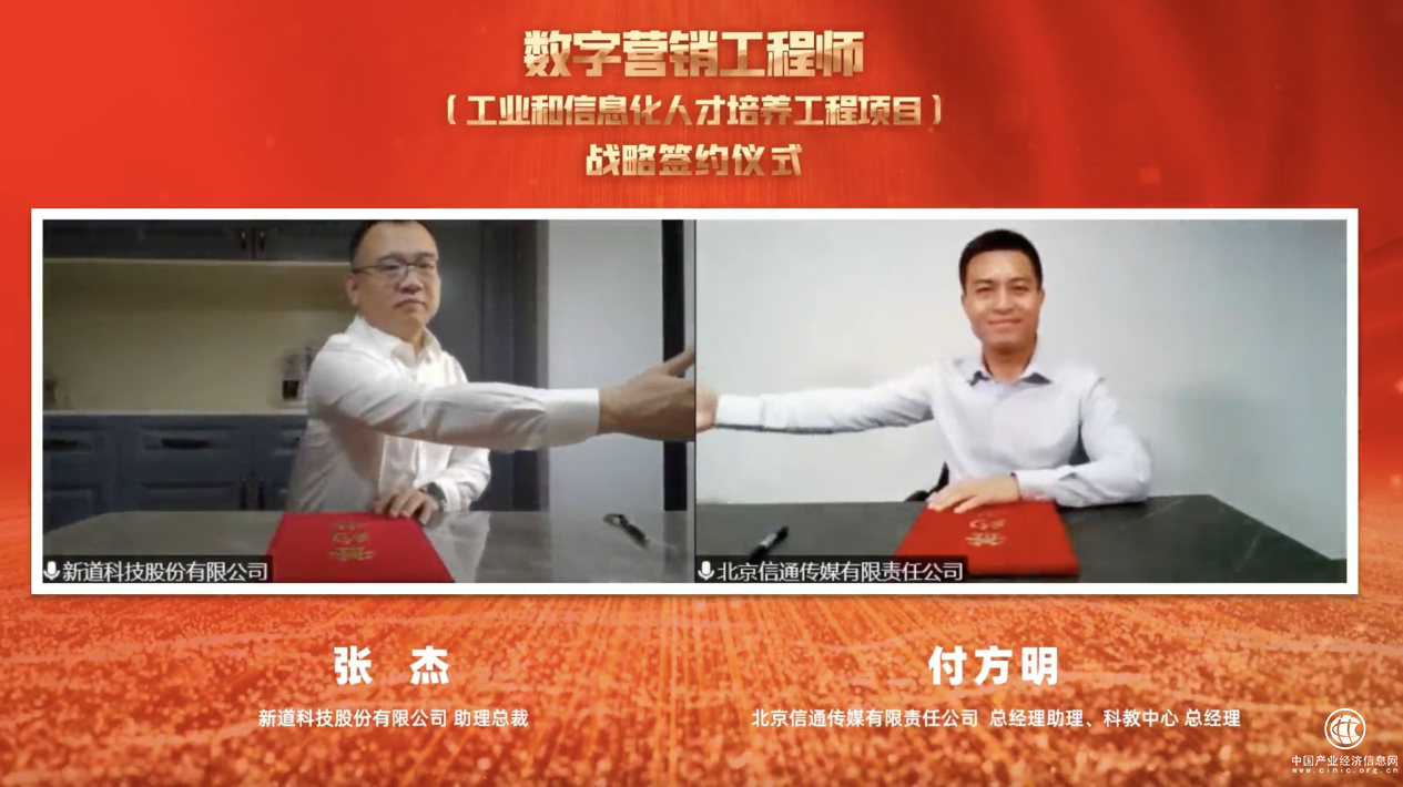 随后,新道科技股份有限公司助理总裁张杰和北京信通传媒有限责任公司总经理助理、科教中心总经理付方明签署了战略合作协议,宣告了数字营销工程师(工业和信息化人才培养工程项目培训项目)正式启动。
