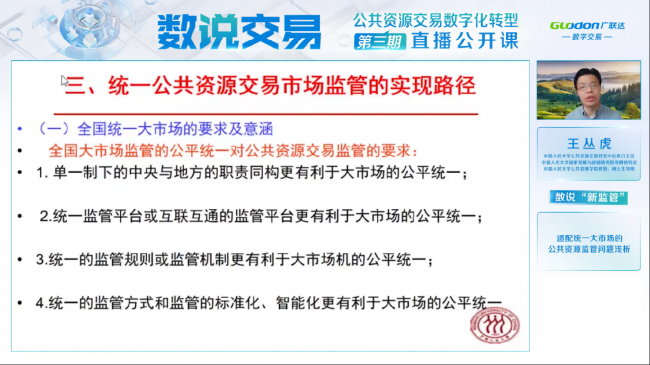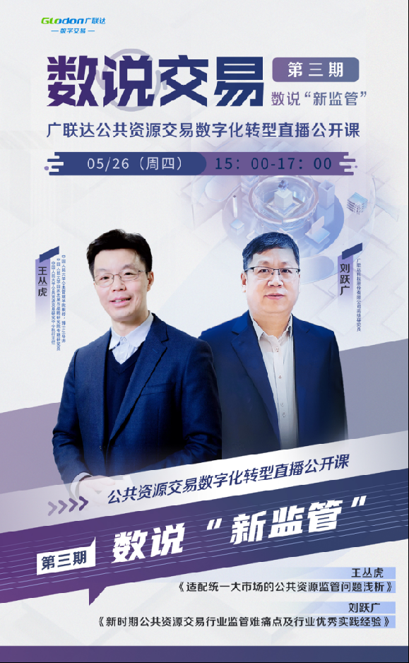 5月26日,第三期《数说交易》直播课圆满结束,中国人民大学公共管理学院教授、博士生导师;中国人民大学国家发展与战略研究院专聘研究员;公共资源交易研究中心执行主任王丛虎和广联达科技股份有限公司数字交易事业部高级研究员刘跃广,围绕公共资源交易市场监管现状、发展趋势以及创新应用案例进行精彩演讲,引来全国各地两千余名观众观看和点赞。
