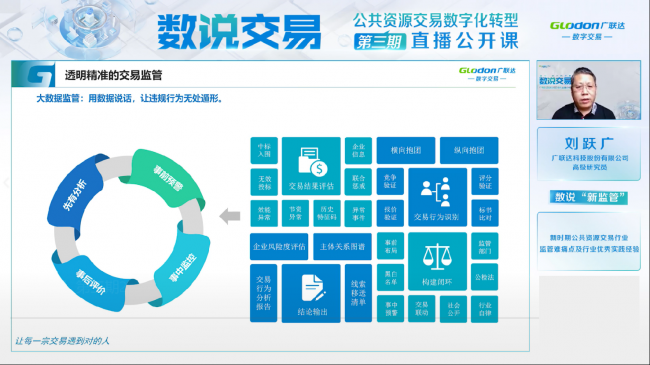 根据王丛虎教授抛出的公共资源交易监管优化思路,刘跃广从技术和应用层面进行了补充,讲解了数字化转型如何推动公共资源实现透明精准的交易监管。