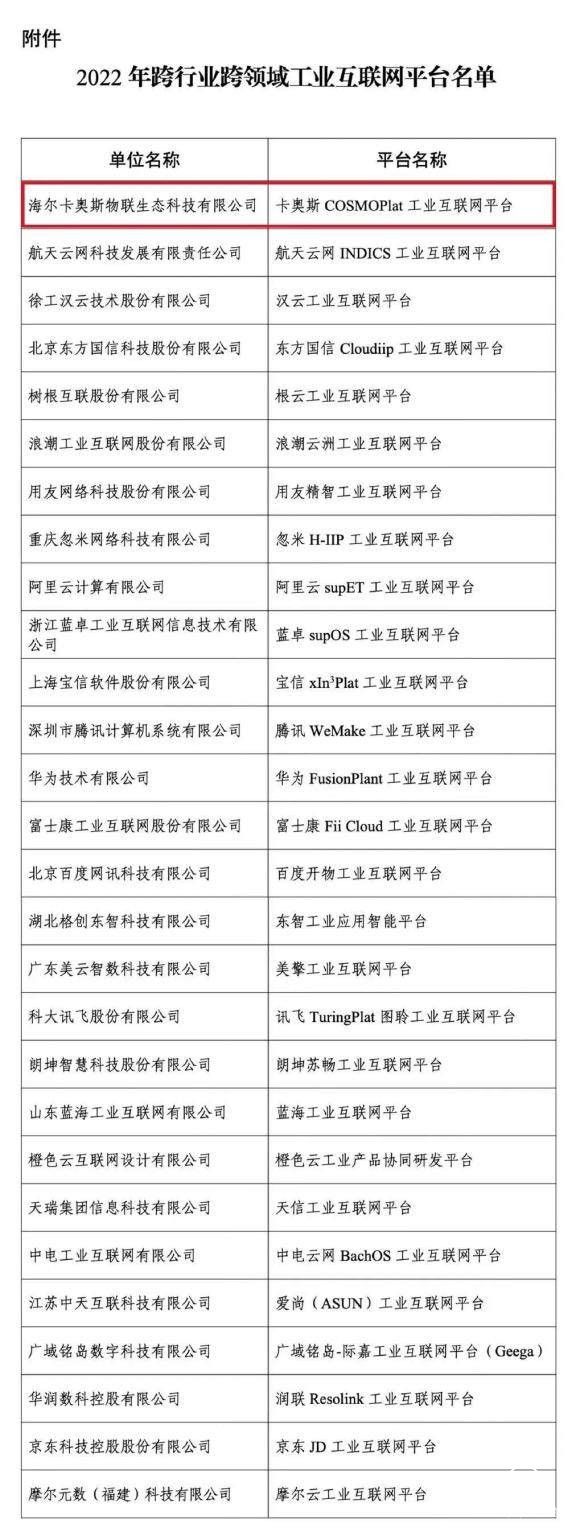 日前,工信部公布2022年跨行业跨领域工业互联网平台名单。卡奥斯COSMOPlat工业互联网平台再居榜首,连续四年蝉联“国家队”第一。