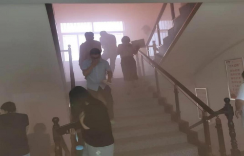 紧急疏散信号响起,现场指导人员立即疏导办公楼内人员以顺墙、低姿、捂住口鼻、弯腰的方式依次沿着办公楼内指定的楼梯通道,快速有序撤离到安全地带,并进行灭火器的使用方法演练。
