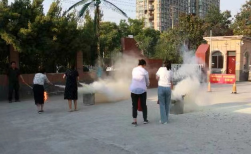 “使用前将灭火器颠倒几次让筒内的干粉松动,然后去掉灭火器的铅封,拔掉保险销。用左手握着喷管,用右手提着压把,在距离火焰两米处的地方,右手用力压下压把,左手拿着喷管进行摇摆让喷射的干粉完全的覆盖在燃烧区,直到扑灭火灾为止。”讲解人员说道。