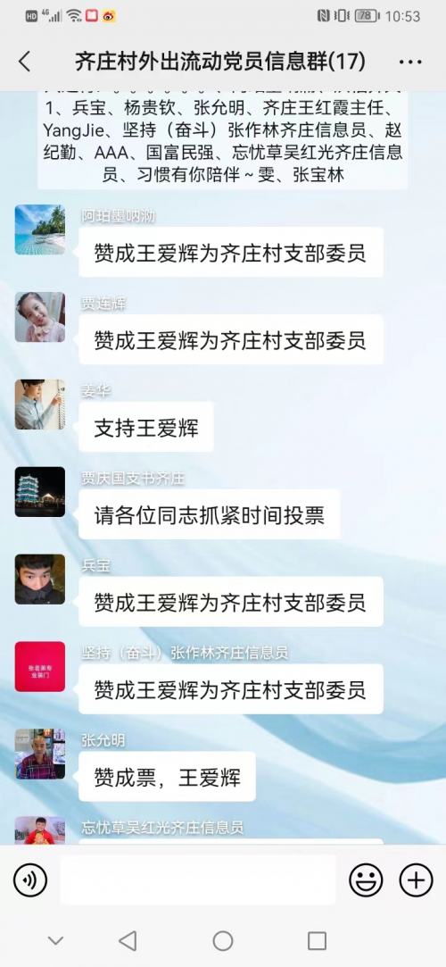 “综合齐国祯、王爱辉两位党员的基本情况,我投王爱辉同志一票。她做为南昌理工学院的大学生,在外工作几年后现在愿意留村发展,值得肯定和支持。同时也感谢驻村第一书记刘涛同志为我村推荐的人才及组织对我们在外党员的信任。”“大学生村官,我投票支持王爱辉、我投票支持王爱辉”