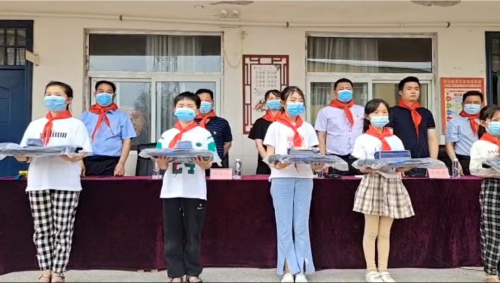 在杨楼小学教学楼前,冯塘乡杨楼小学校长代表学校对淮阳区烟草专卖局的帮助和真情关怀表示衷心感谢,多年来,淮阳区烟草局驻村工作队帮助冯塘乡杨楼行政村开展精准扶贫和乡村振兴,并给予学校物质上的支持,为教育事业的发展添砖加瓦,践行责任。学生们为前来慰问的工作人员佩戴了鲜艳的红领巾,表示着深深的感谢。