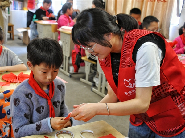 图为“香溢”志愿者与学生们一起制作红色手工。巫晓俊摄