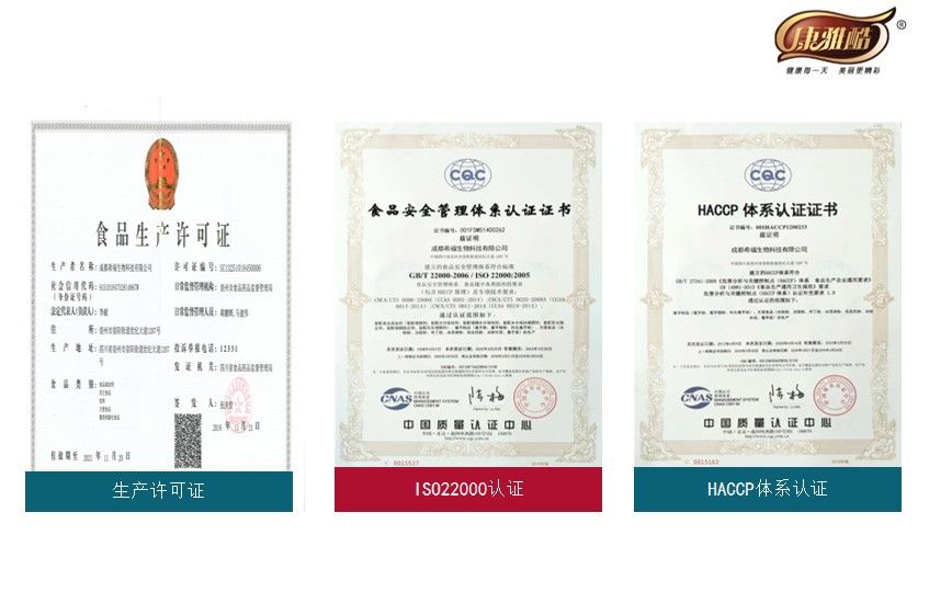 康雅酷自创立以来,精准定位品牌自身内容:为客户提供安全、优质的产品和高效、完善的食品应用。随着人们对健康食品需求度的不断提升,为了确保公司的研发能力和技术更新速度,希福公司引用了先进的检测及生产设备,并拥有了自己的原料基地,配备高素质的科研、生产、销售人才。接连通过了HACCP、ISO22000等一系列相关认证。