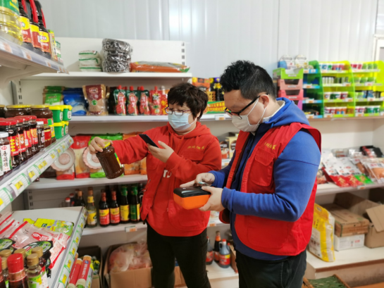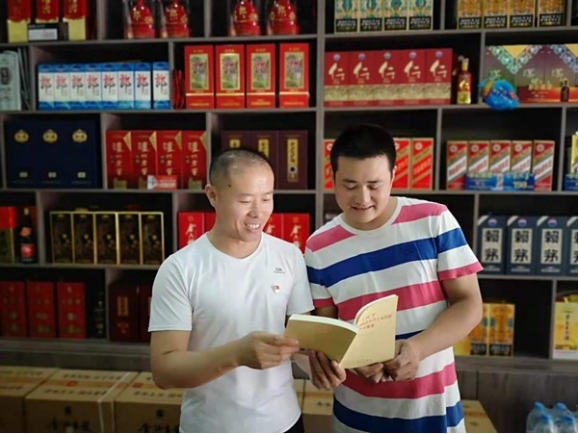 图为党员志愿者帮助农村零售户整理非烟柜台商品,助力乡村振兴