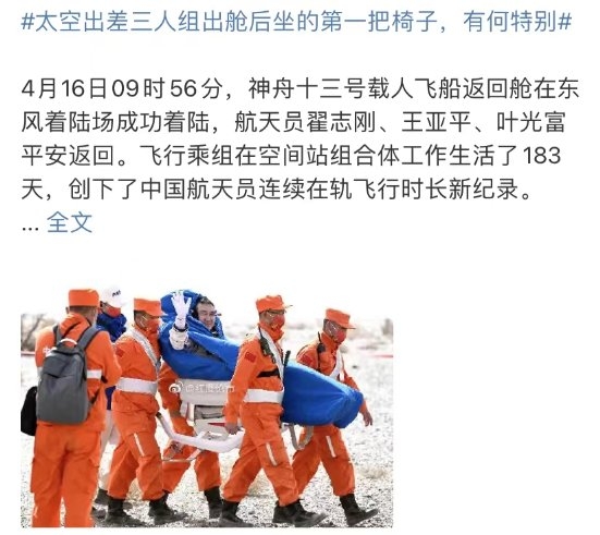 内容包括“神舟十三号返回舱在京开舱”、“直击神舟十三号航天员乘组抵京”、“神舟十三号创造了哪些史上第一”等。其中一条“太空出差三人组出舱后坐的第一把椅子,有何特别”更是冲上了热搜,引起了广大网友的强烈关注,一夜之间,这把椅子火遍全网。甚至火爆到了消费市场,网友们全网搜索哪里有卖的,纷纷表示想要get航天员同款椅子。