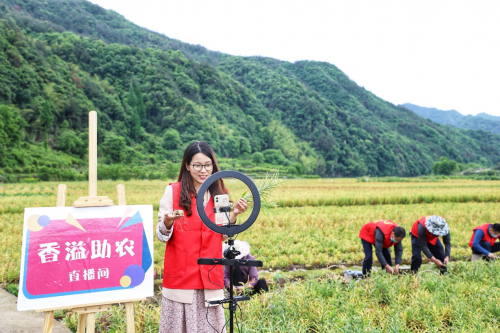 图为:“香溢”青年志愿者为农网零售客户拍摄引流小视频。(夏浩坚/摄)
