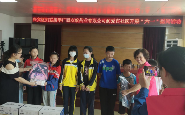 值此“六一”国际儿童节即将到来之际,来宾市兴宾区妇联携手广西双蚁药业有限公司到兴宾区河西街道爱宾社区开展丰富多彩的“六一”儿童节慰问活动,并为该社区15名留守(困境)儿童送上牛奶、书包、铅笔盒等生活用品和学习用品,及节日的祝福,与孩子们提前度过一个难忘而快乐的节日。