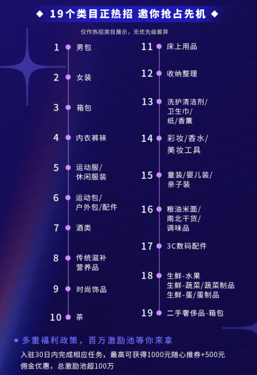 此外,针对5-6月的线上消费爆发期,抖音电商还释放了热招类目信息并推出了更多商家成长激励政策。抖音电商根据热招类目信息显示,目前包括男包、女装、箱包等在内的19个类目正在热招中,除基础权益外,入驻30天内完成相应任务,最高可获得1000元随心推券以及500元的佣金优惠。