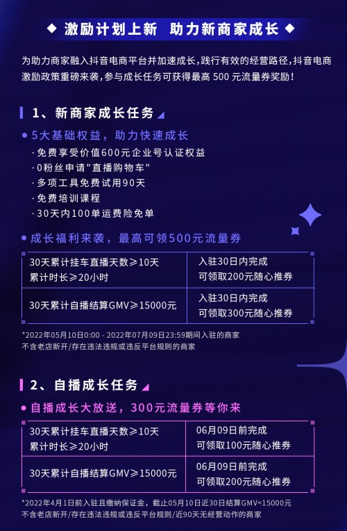 同时,对于今年5月10日至7月9日期间入驻的新商家,抖音电商还推出了一系列新政策,新商家入驻即可享受企业号认证权益、免费课程培训、免费工具试用90天等基础权益。基础权益上,登录抖店PC任务中心参与成长任务,还可获得最高500元的流量券奖励。