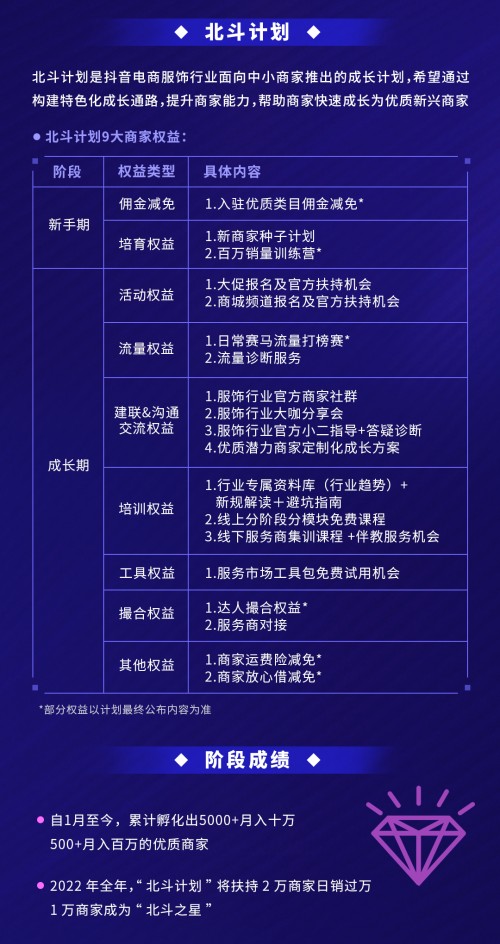 可见抖音电商生态正在快速发展,这也给了大量企业在流量端、商品端、服务端的机遇。与此同时,抖音电商服饰行业还面向中小商家推出了“北斗计划”,通过9项扶持权益,帮助中国服饰行业的中小商家快速成长为优质新兴商家。根据官方介绍,“北斗计划”预计将在2022年全年扶持超过2万商家日销过万,超1万商家即将成为“北斗之星”。