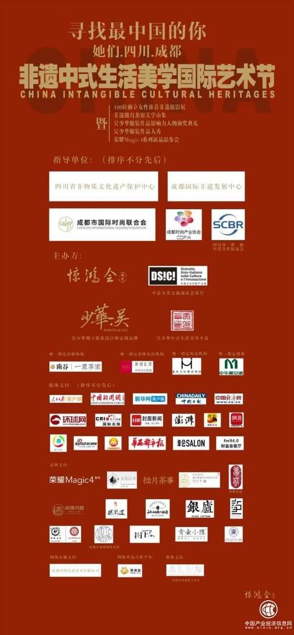 特别指导单位:四川省非物质文化遗产保护中心、成都国际非遗发展中心、四川省一带一路经贸合作促进会、成都市国际时尚联合会、成都时尚产业协会及各大媒体品牌商。