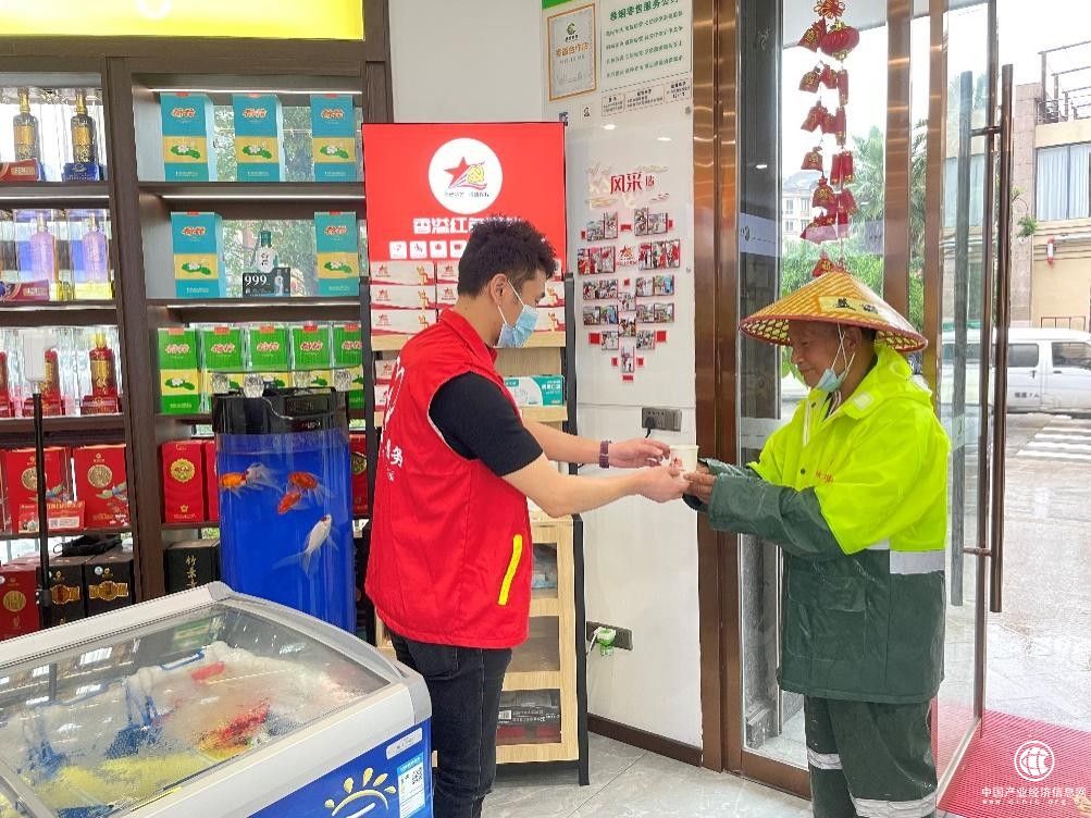 淅淅沥沥的小雨下个不停,“香溢”红色驿站店主小颜招呼马路边的一位避雨的保洁员大哥进店歇一歇,将一杯早早沏好的热水递到他手中,并询问是否需要一件雨衣。保洁员大哥从一开始局促腼腆,到渐渐放下拘谨与小颜聊起了天。