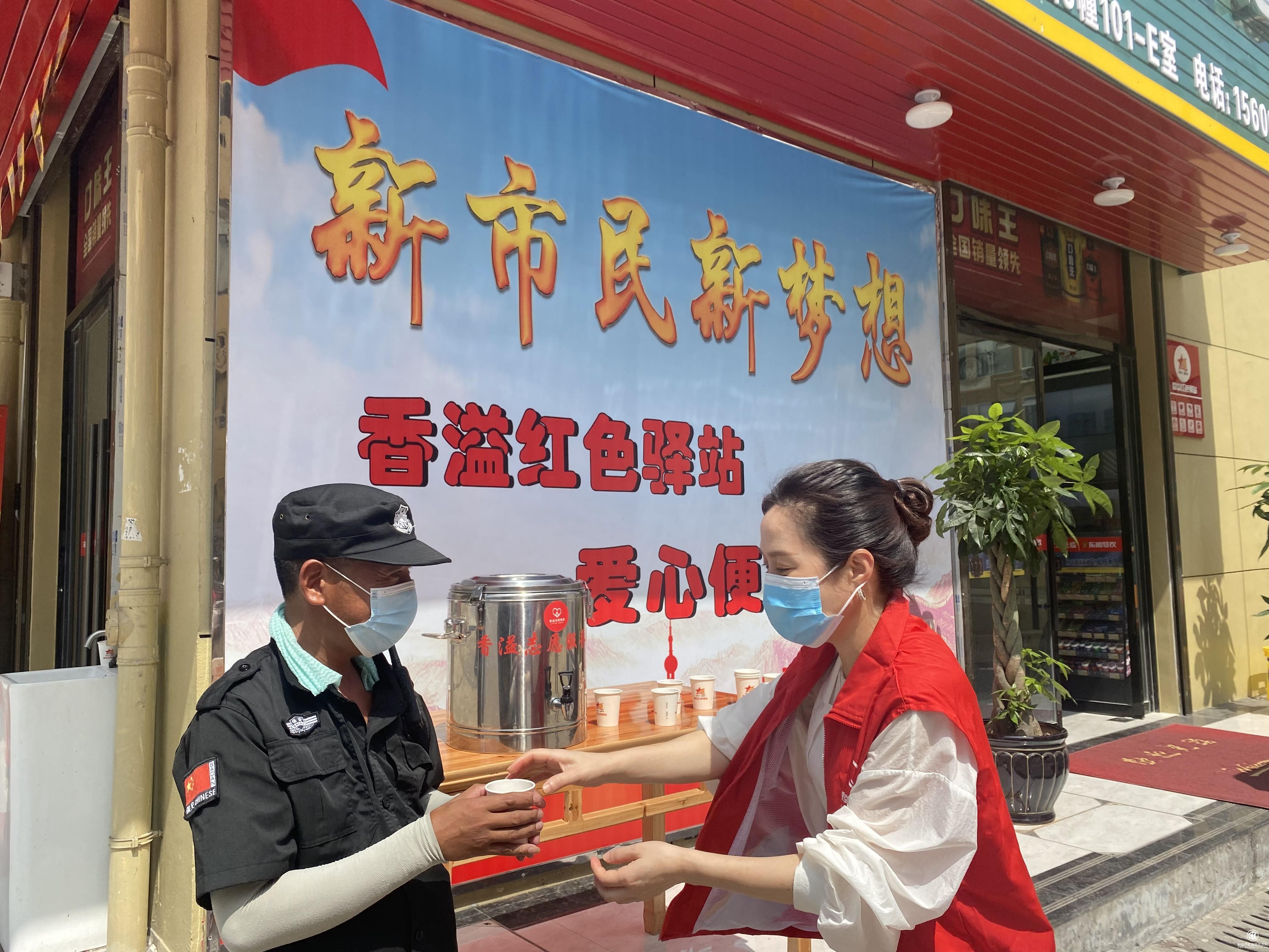 “这种天气在户外工作真的很热,你看,我脖子上的毛巾都被汗水打湿了。路过的时候看到你们这里有茶水供应,真的很方便,这样的服务真是送到我们心坎儿上了!”社区保安大叔为驿站服务连连点赞。
