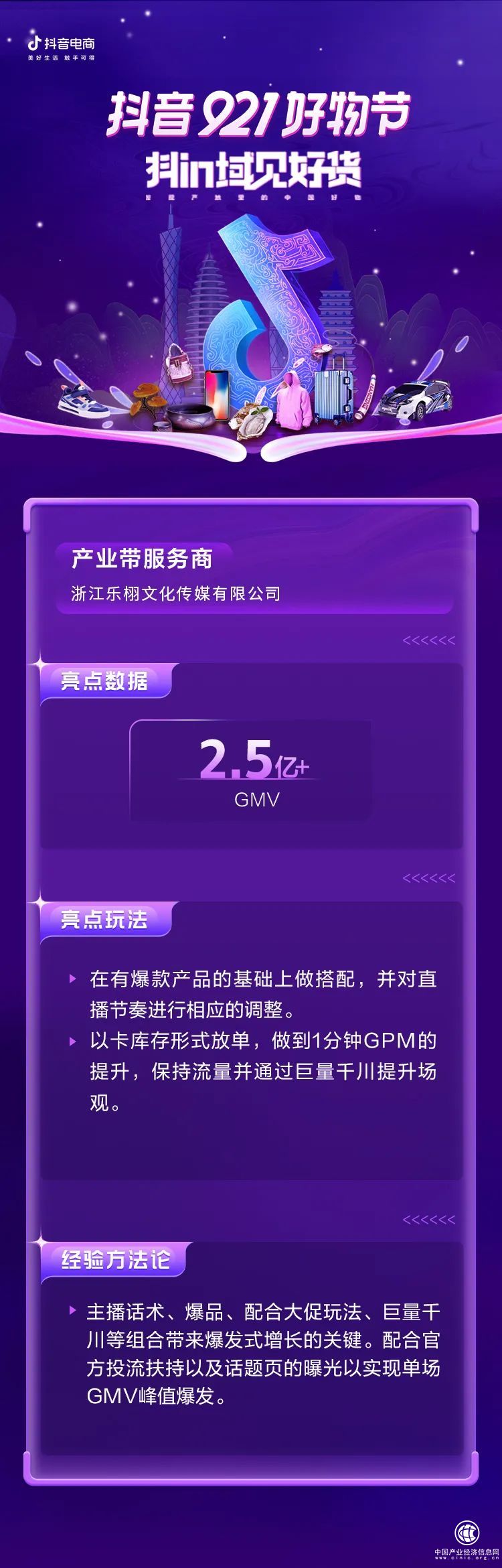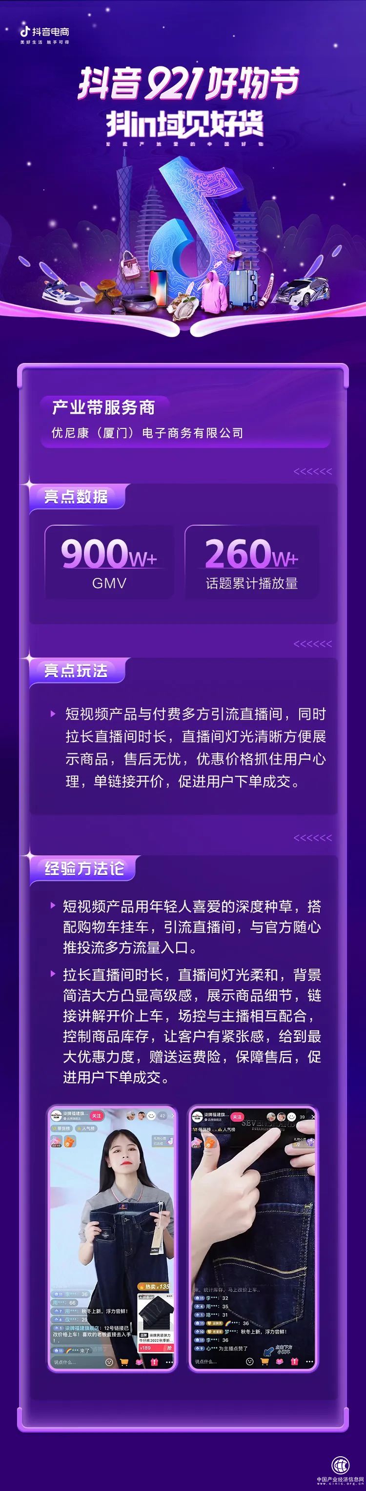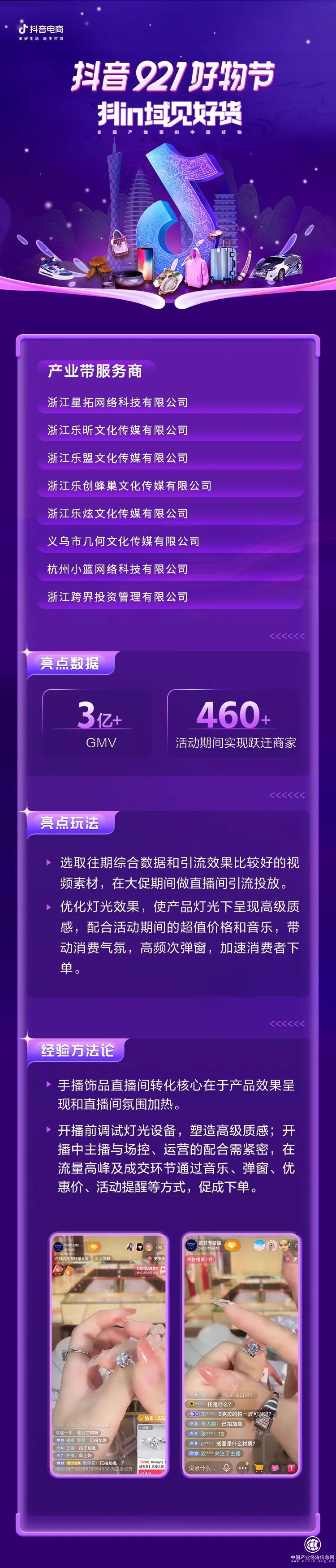 据统计,921好物节「抖in域见好货」期间,中小商家泛商城生意、产业带服务商总生意、品牌服务商生意均得到新发展,产地名片话题总播放量突破亿,吸引海量用户围观。义乌商城好货产业带、海宁皮草产业带、嘉兴秋冬服饰产业带、杭派女装产业带、广东潮流女装等产业带生意数据亮眼,织里童装则凭借破亿播放量赢得全网关注。