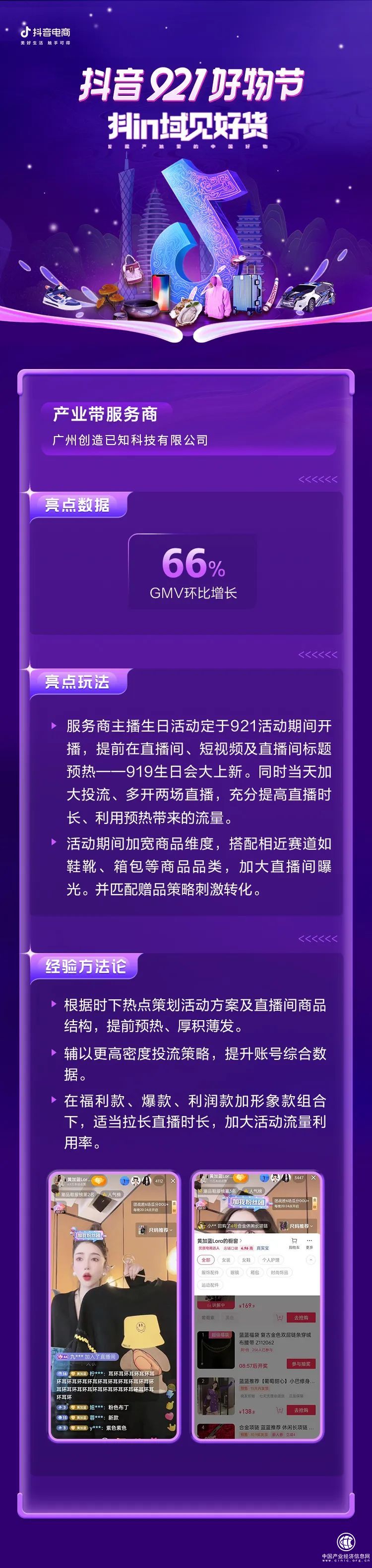在大促氛围基础上,服务商也能结合节点,带动生意“节节攀升”。比如,服务商「广州创造已知科技有限公司」,便带领广东潮流女装产业带商家走上了生意巅峰。借助主播生日会大上新与好物节热度,通过投放、货品、预热等多项动作优化,广东潮流女装产业带商家GMV环比增长66%。