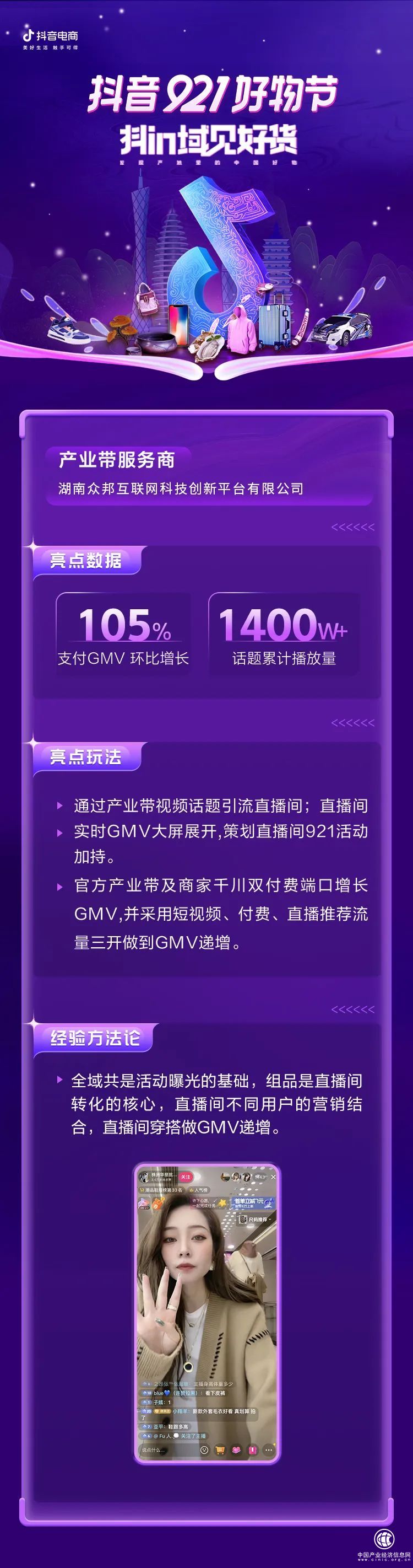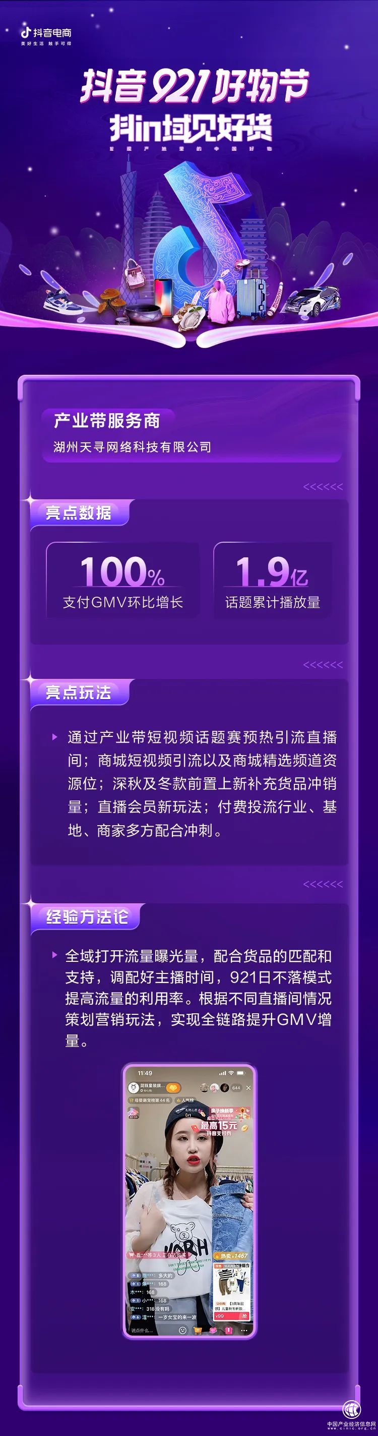 「湖州天寻网络科技有限公司」帮助织里童装成功实现1.9亿话题播放量,支付GMV直接翻倍,其方法论在于:通过短视频话题赛预热引流直播间,加强商城短视频引流以及商城精选频道资源位曝光,帮助产业带商家实现“全域打开流量”。