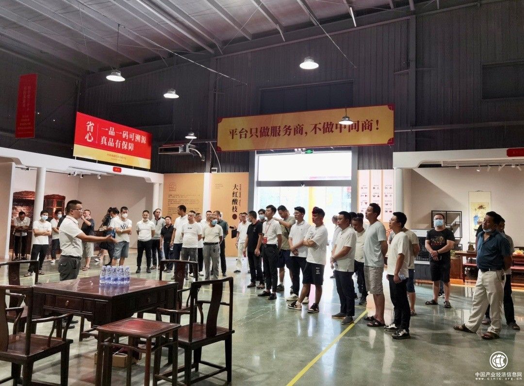 图为百余名红木厂商实地参观3万平方米展厅,现场学习“平台理念,共享经济,新零售模式”