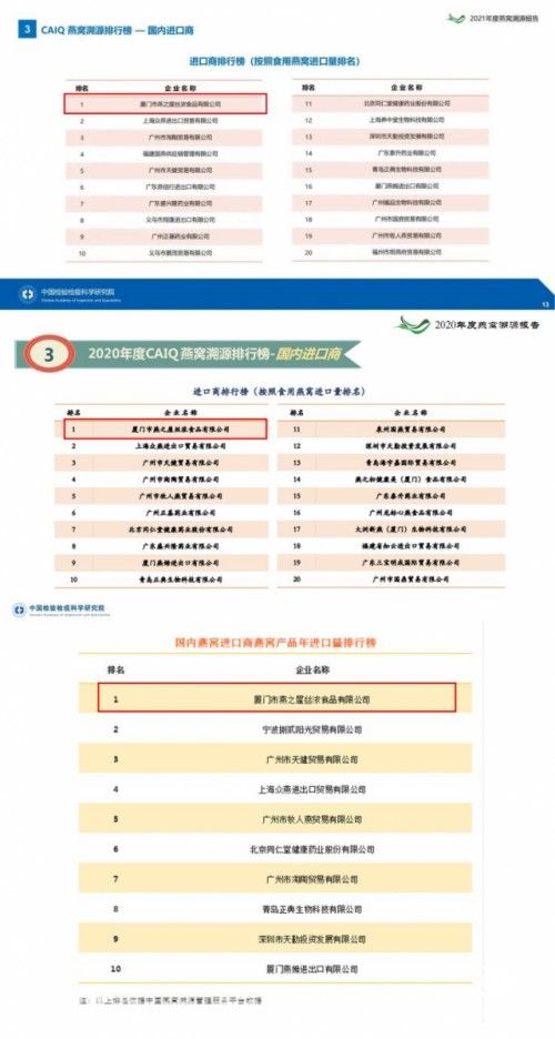 图:燕之屋2019-2021连续三年位列《CAIQ国内燕窝进口商燕窝产品年进口量排行榜》榜首