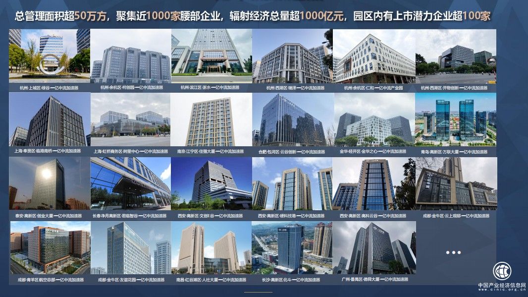 已在杭州、上海、南京、金华、合肥、青岛、泰安、西安、成都、广州、南昌、长沙、长春等核心城市落地,总管理加速器面积超50万方,聚集近1000家腰部企业总部集中加速,辐射经济总量超1000亿元。至2025年,一亿中流加速器目标总管理面积突破200万方,100座一亿中流加速器,聚合4000家成长型腰部企业。