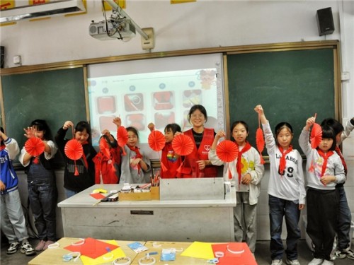 图为:志愿者与同学们一起展示红色手工作品(巫晓俊 摄)