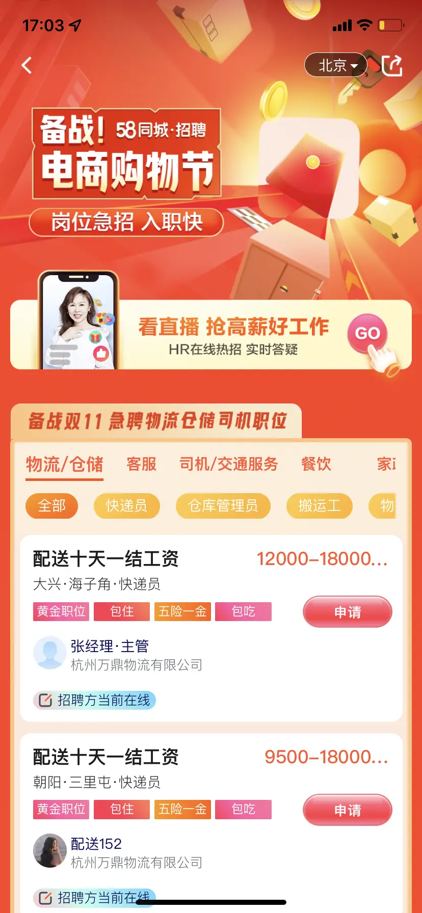 物流行业是典型的体能型、劳动密集型行业,由于工作环境艰苦、劳动强度大、招聘求职双方信息不对称等原因,对年轻人缺乏吸引力,加上当前行业竞争激烈,“招工难”成了困扰许多物流企业经营的痛点。为增强企业与求职者之间的互动,58同城在本次“备战电商购物节”招聘专场开设直播招聘板块,专业主播和企业HR将围绕企业及职位进行实时答疑,助力招聘企业实现声量和效果转化双丰收。