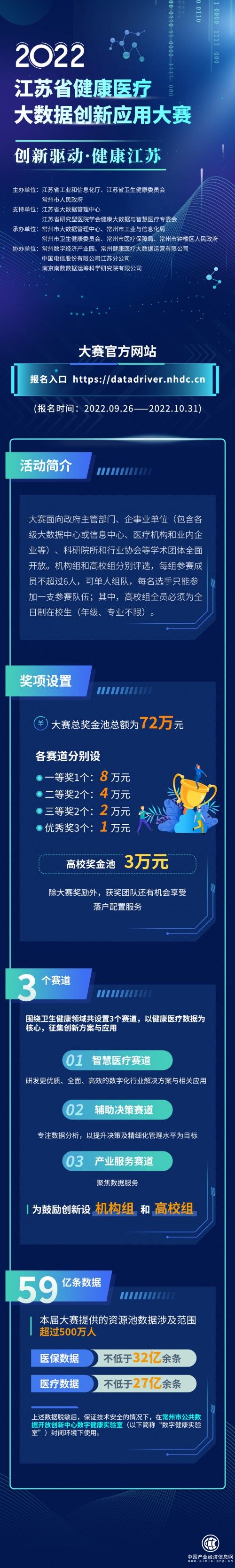 本次大赛从2022年9月26日持续至2023年3月上旬,共分为报名、初赛、决赛和颁奖四个阶段。大赛面向政府主管部门、企事业单位(包含各级大数据中心或信息中心、医疗机构和业内企业等)、科研院所和行业协会等学术团体全面开放,以健康医疗数据为核心元素征集创新方案与应用。
