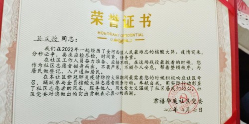 图:燕之屋天津市场操盘手孙庆玲收到君禧华庭社区党委的荣誉证书