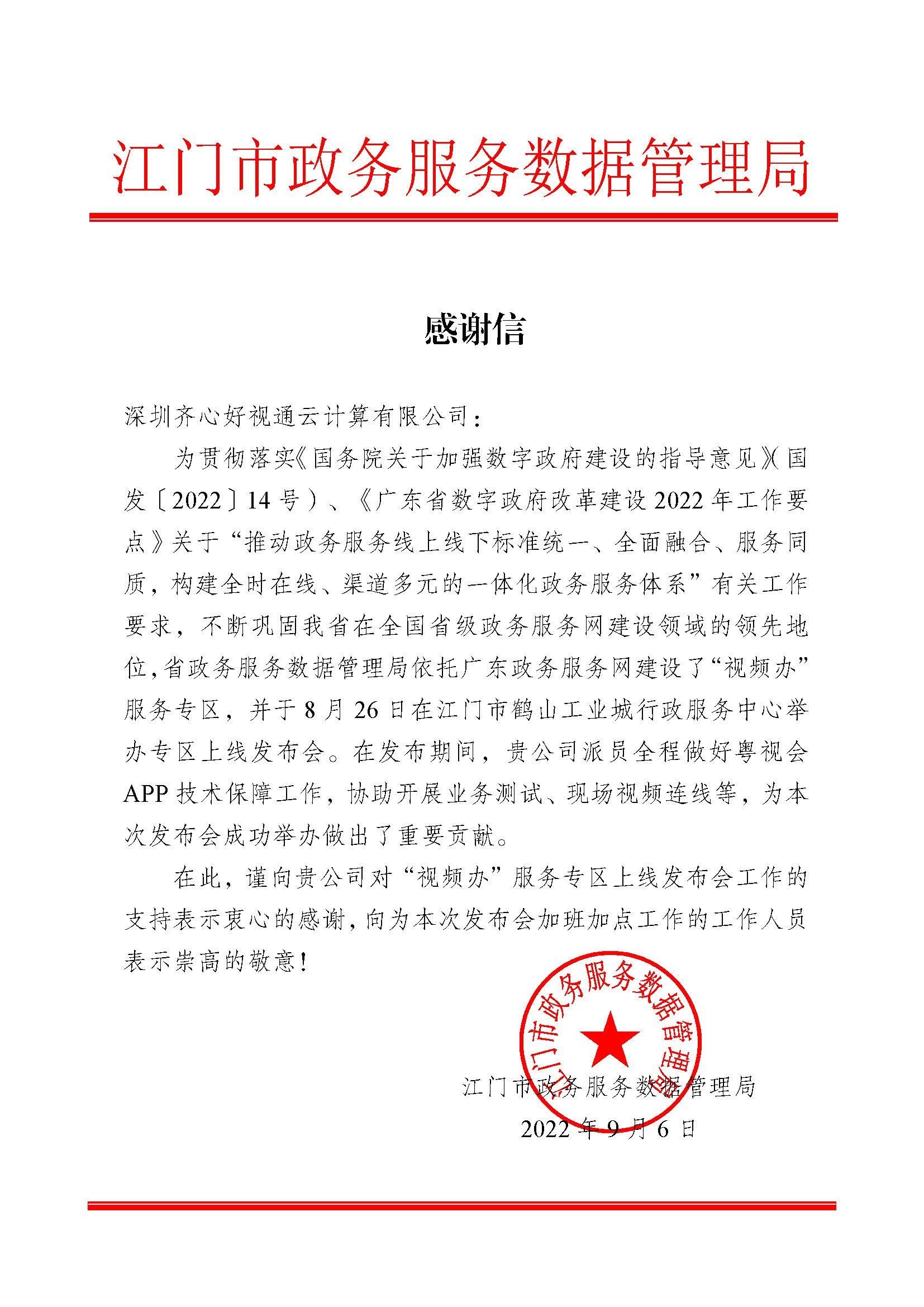 感谢信分别来自中共广东省委党校(广东行政学院)、中共惠州市委党校、广东省政务服务数据管理局及江门市政务服务数据管理局,信中对好视通专业细致的支持保障、高清流畅的云视频会议体验、丰富的产品应用给予了充分肯定与认可。