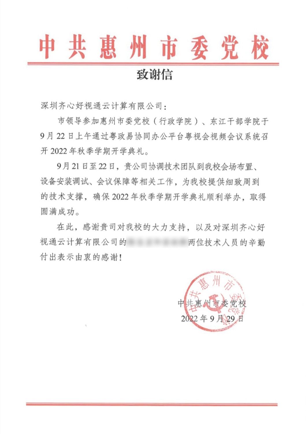 惠州市领导参加惠州市委党校(行政学院)、东江干部学院,通过粤视会平台举行的2022年秋季学期开学典礼期间,好视通技术团队到现场提供了会场布置、设备安装调试、会议保障等相关服务,细致周到的服务确保了2022年秋季学期开学典礼的成功举办。
