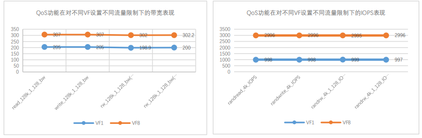 图 2:QoS 功能在对不同 VF 设置不同流量限制下的带宽及 IOPS 表现