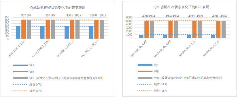图 3: QoS 功能在 VF 状态变化下的带宽及 IOPS 表现