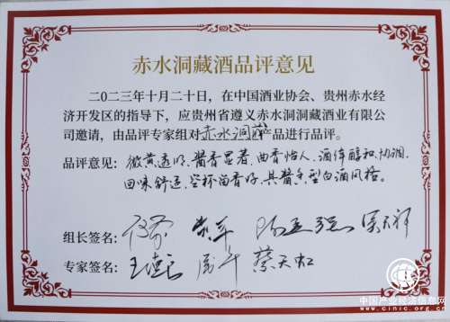 经专家组成员激烈、严谨的商讨,形成了专业、准确的综合品评意见,随后由何勇向所有在场嘉宾展示并宣读:赤水洞藏酒微黄透明、酱香显著、曲香怡人。酒体醇和、协调,回味舒适,空杯留香好,具酱香型白酒风格。