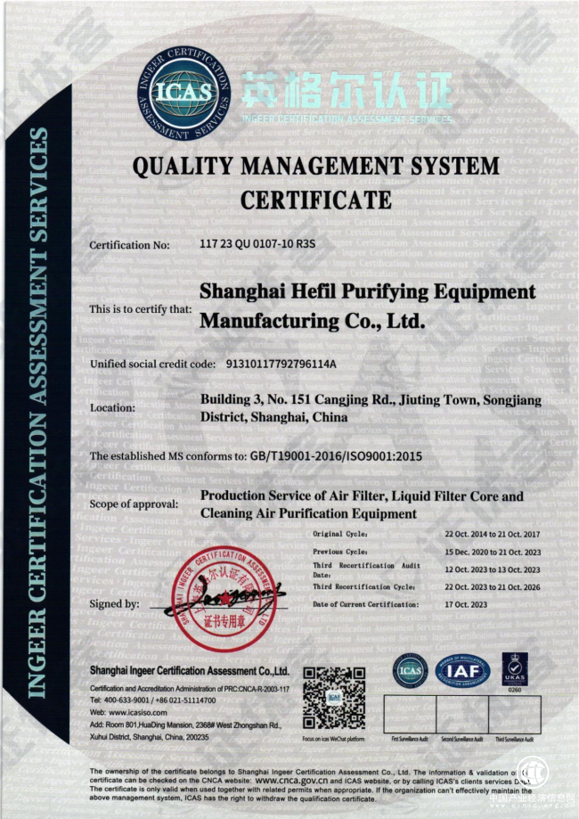 2023年10月22日,上海禾益净化设备制造有限公司再度通过ISO 9001质量管理体系认证复评,并获取证书。禾益环境已经连续十年获得该项证书,证书认证范围包括空气过滤器、液体滤芯及空气净化设备的生产服务。