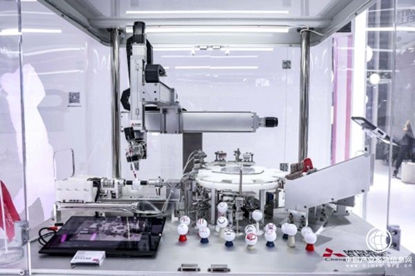 此次参展,三菱电机带来了多项科技感和趣味性十足的打卡互动体验,吸引了大批观众驻足,最吸睛的莫过于高尔夫球绘图包装展机。通过五轴联动运行、二维平面转换三维球面轨迹算法、数字孪生等核心技术,机械控制臂可在半径为21.3mm的高尔夫球面进行精细绘画,不到2分钟即可完成高尔夫球上的绘画与制盒包装,引发现场阵阵惊叹。三菱电机通过生动形象的方式,将自己的高精密智能制造能力完美展现。