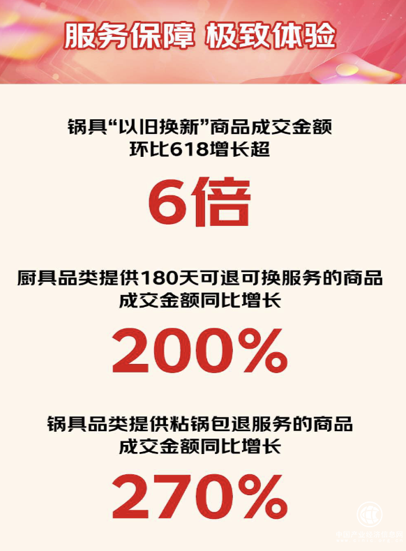 京东厨具服务继续迭代升级,为消费者带来省心购物体验。京东11.11期间,厨具品类提供180天可换可退的商品成交额同比增长超200%,锅具“以旧换新”商品成交额环比618增长超6倍,锅具品类提供粘锅包退服务的商品成交额同比增长270%。