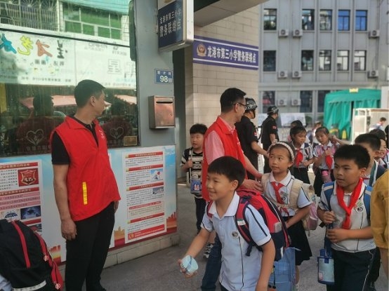 图为“香溢”志愿者们护送小学生安全入校。陈影/摄