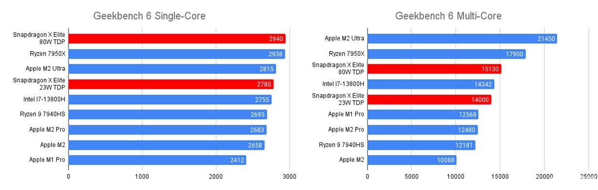 如果这些参数还无法让你相信骁龙X Elite的强悍,那就跑个分吧。骁龙 X Elite 拥有两个版本:注重续航表现的 23W 版本、主打性能的 80W版本。Geekbench 6测试下的单核和多核得分情况如下图所示,单核性能尤为亮眼。
