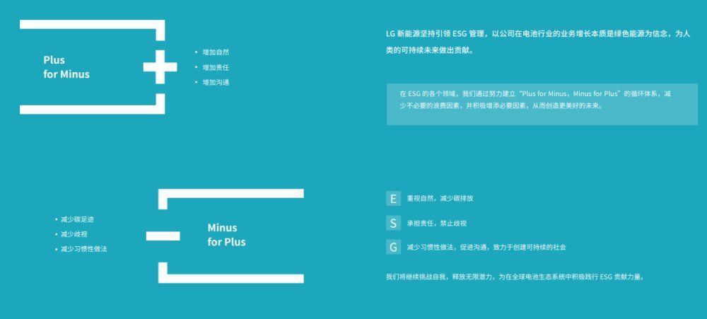 LG新能源自2020年12月独立运营后,已连续三年发布中文版ESG报告。此次发布的《2023 LG新能源(中国)环境、社会及管治(ESG)报告》中,LG新能源在“赋能更美好未来”的ESG经营愿景上,公布了今年的ESG口号,“Plus for Minus,Minus for Plus(此消彼长,万物共生)”强调在环境、社会及管治三大治理领域中,像正负两极之间自然流动的电极一样,通过减少不必要的浪费因素,并积极添加必要因素,从而创造更美好的未来。该报告是企业积极向本地公众传播企业ESG理念的同时,更全面的披露了在环境、社会及管治方面的管理、实践和成效,以树立行业标杆水平。