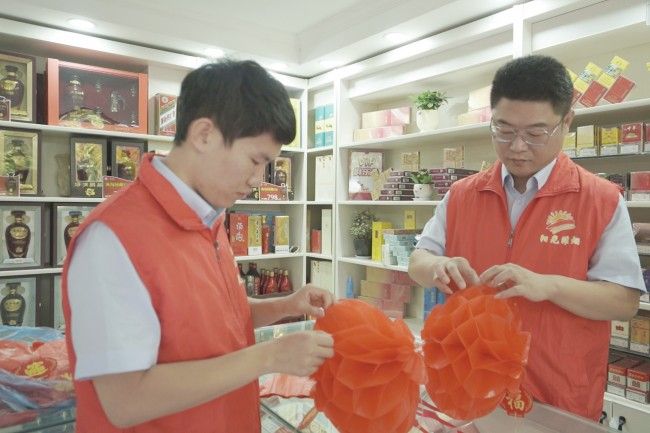 图为青年志愿者为客户装饰店面,营造节庆氛围。(拍摄者:张利)